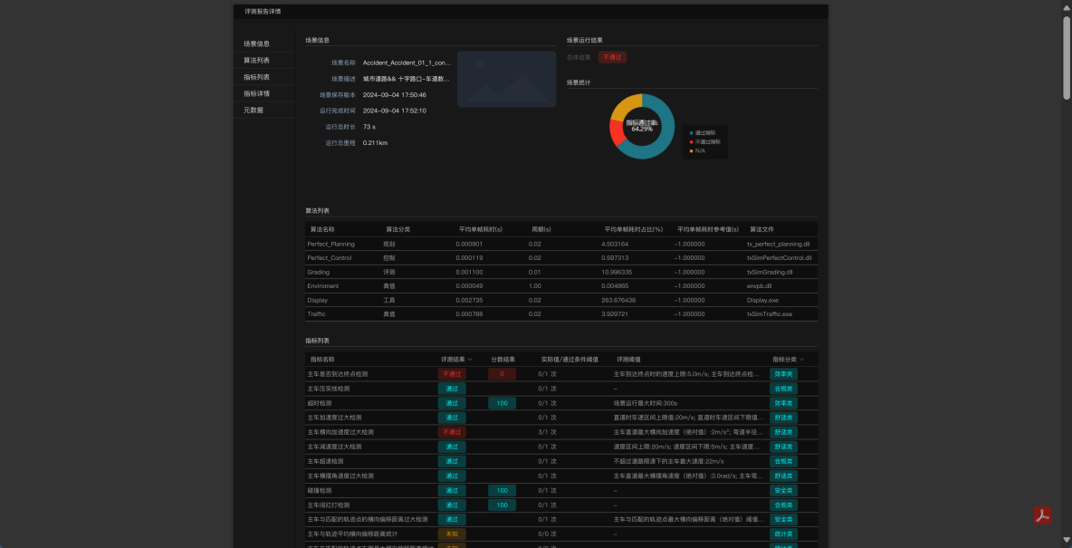 在场景的几何还原上,模拟仿真平台做到三维场景仿真和传感器仿真,让环境和测试车辆条件都与现实世界相同;在场景的逻辑还原上,在虚拟世界中模拟出测试车辆的决策规划过程;在场景的物理还原上,模拟出车辆的操控和车身动力学作用结果,三种层次的还原之后,可以在虚拟世界中看到与现实世界无限接近的自动驾驶测试结果。同时,为了满足真实世界中各种场景和驾驶的可能性,仿真平台满足高并发的特点,实现所有场景下车辆反应的排列组合。TAD Sim内置高精度地图,可以完成感知、决策、控制算法等实车上全部模块的闭环仿真验证。不同天气、光照条件等环境的几何模拟,以及测试车辆的感知能力、决策能力、和车辆控制仿真实现。结合采集的交通流数据,以及更多极端交通场景的模拟,在TAD Sim上可以进行各种激进驾驶、极端情况的自动驾驶测试,以更高效率、更安全的方式完成在现实世界中无法进行的各项测试。